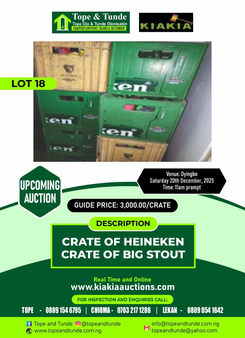 Kindly note that the Crate Of Heineken And Crate Of Big Stout will be picked by the successful bidder