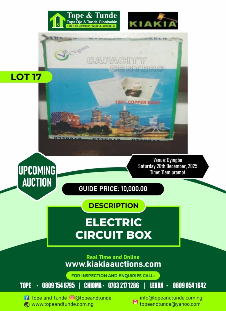 Kindly note that the Electric Circuit Box will be picked by the successful bidder