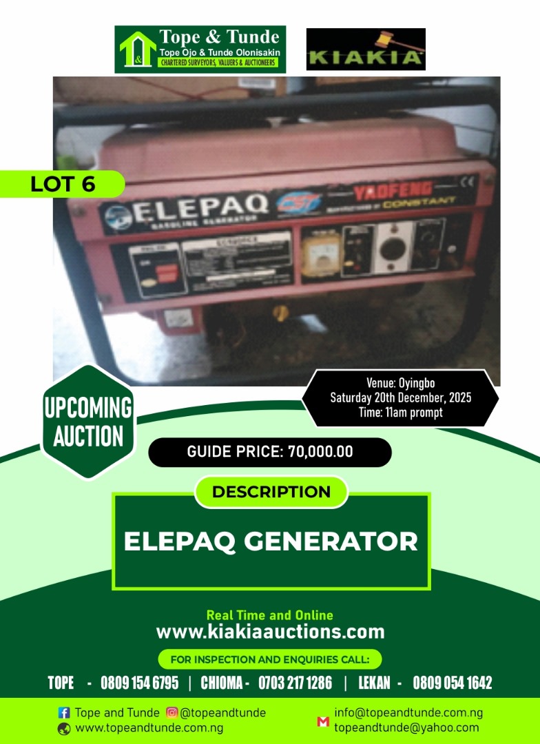 Kindly note that the Elepaq Generator will be picked by the successful bidder