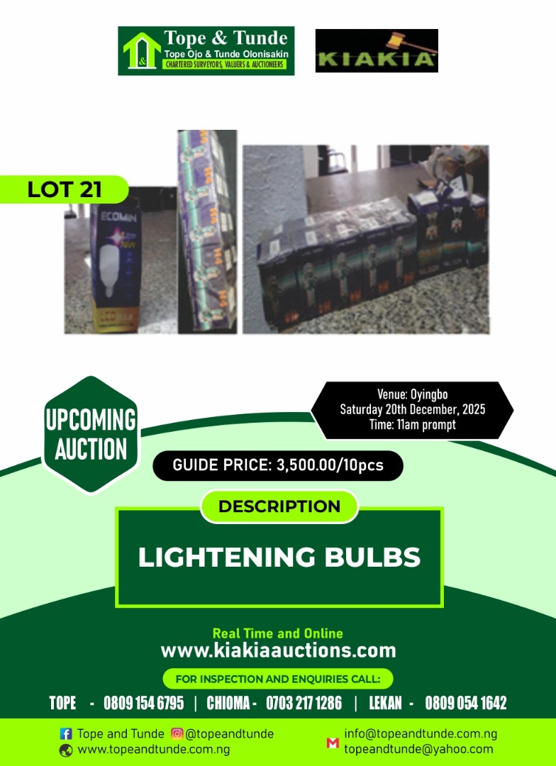 Kindly note that the Lightening Bulbs will be picked by the successful bidder