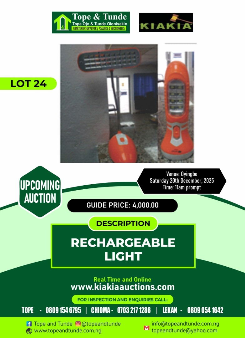 Kindly note that the Rechargeable Light will be picked by the successful bidder