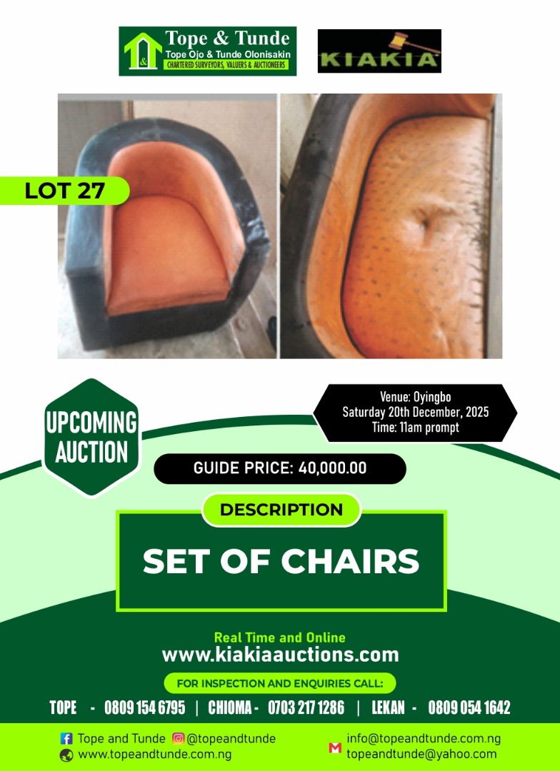 Kindly note that the Set Of Chairs will be picked by the successful bidder